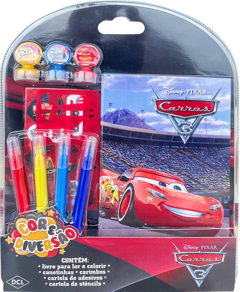 Muita cor e diversão aguardam os pequenos neste kit com os personagens do filme Carros! Ele vem com canetinhas, carimbos, adesivos, estêncil e um livro repleto de desenhos para colorir!