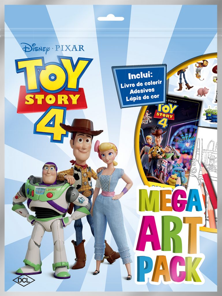 Este kit inclui livro de colorir, cartela de adesivos e lápis de cor em uma linda embalagem metalizada com os personagens de Toy Story 4.