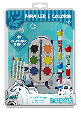 Livro cheio de diversão e aventuras com os Robôs mais malucos do pedaço. Este blister inclui livro para ler e colorir, gizes de cera, paleta de aquarela e canetinhas com carimbos acoplados.
